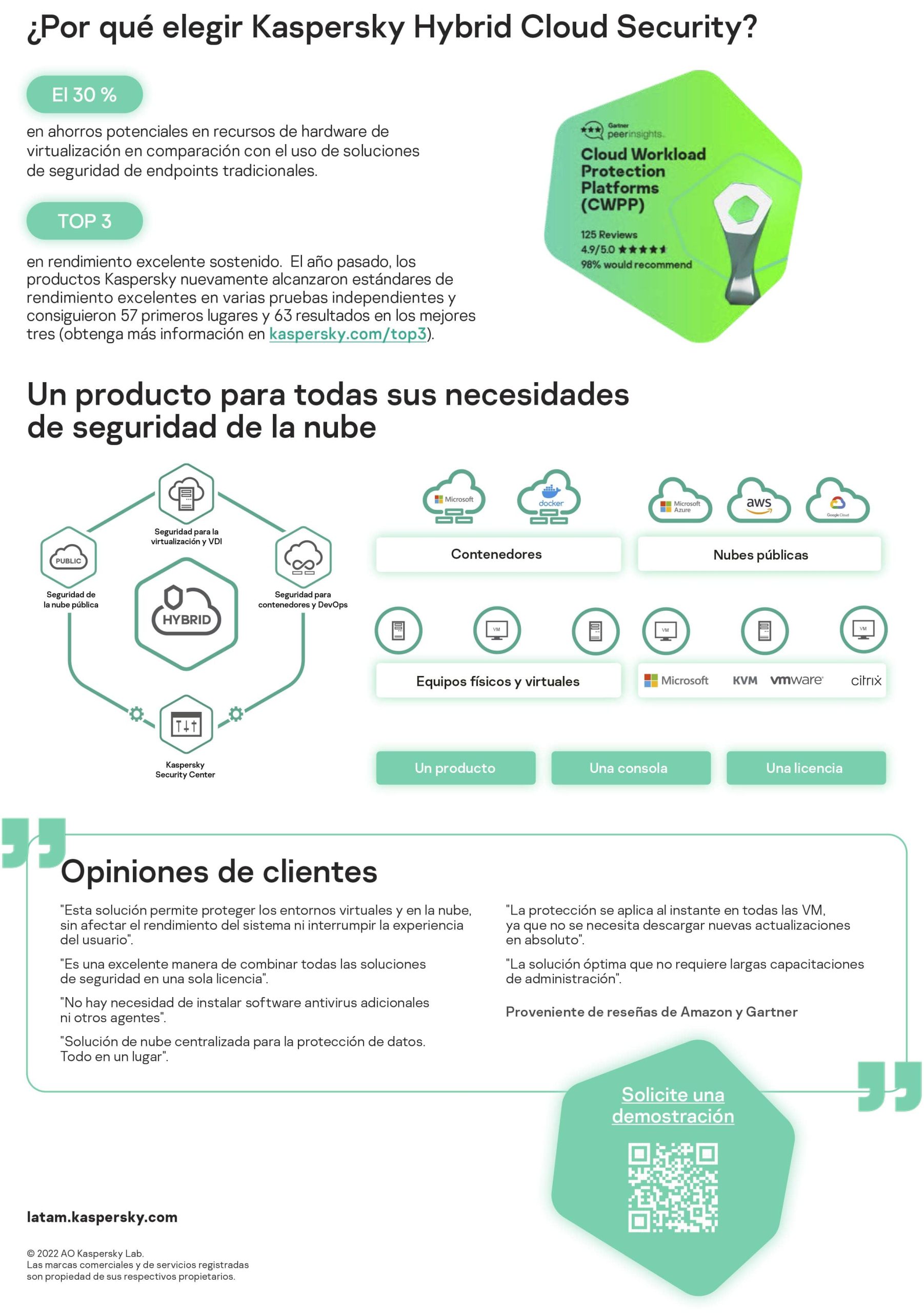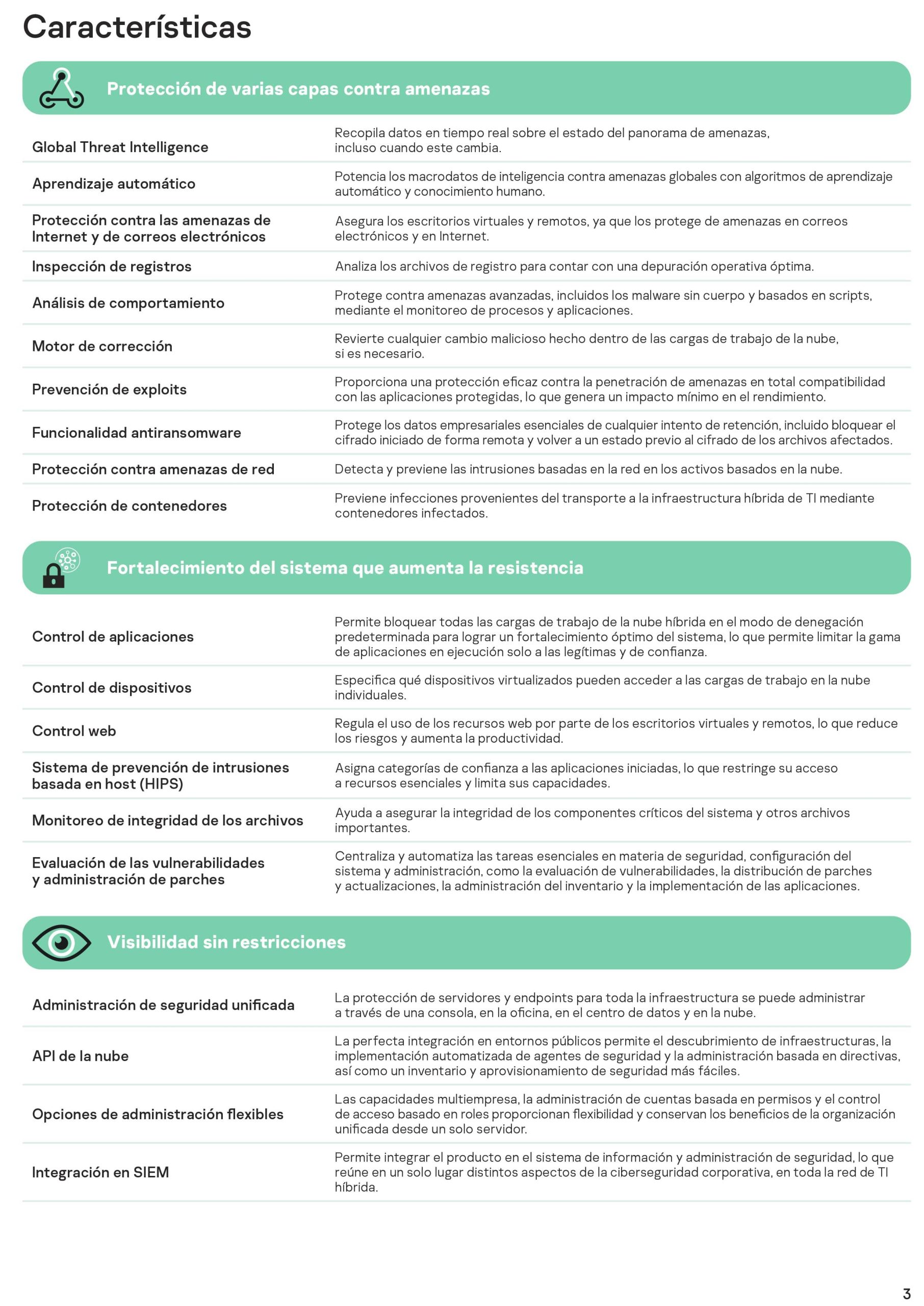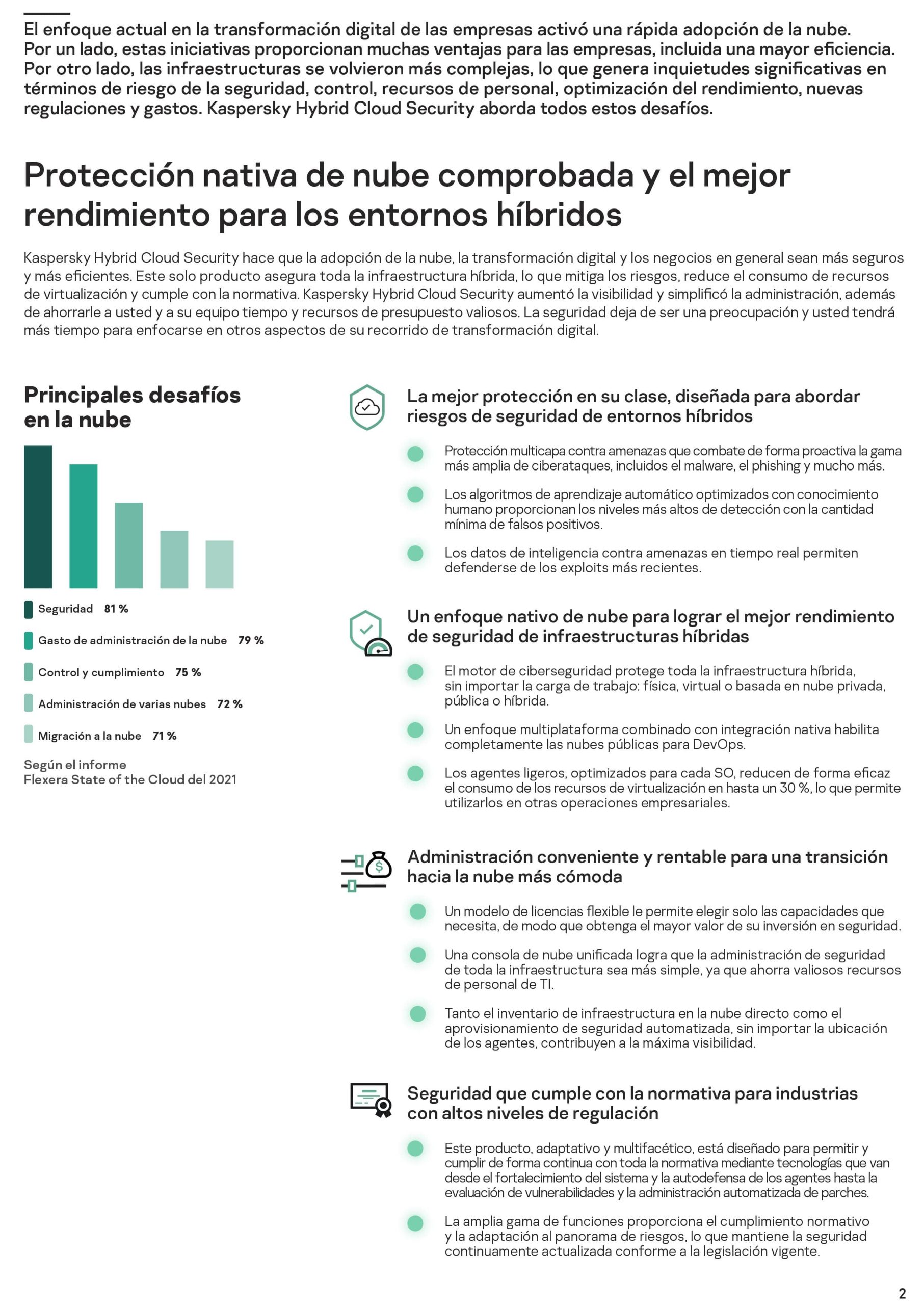 Kaspersky Hybrid Cloud Security ofrece protección, visibilidad y control eficientes de cargas de trabajo virtuales y en la nube para infraestructuras de TI híbridas, sin efectos negativos en los sistemas ni en los usuarios. Las tecnologías de seguridad de múltiples capas (como el fortalecimiento del sistema, la prevención de exploits, la supervisión de la integridad de los archivos, el bloqueo de ataques a la red y el antimalware, tanto estático como basado en el comportamiento) brindan protección integral en toda la infraestructura, desde servidores y escritorios virtualizados hasta instancias de nube pública (AWS, Azure, Google Cloud).
